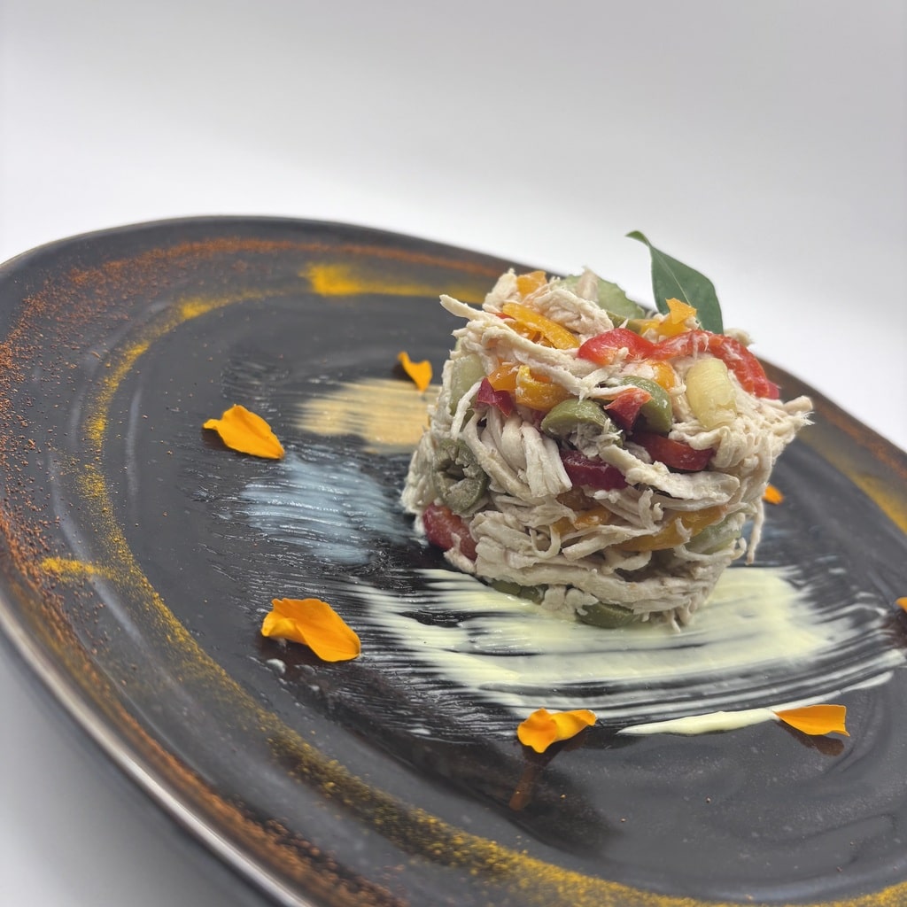 Tenere strisce di pollo, olive verdi croccanti, sedano fresco e peperoni a filetti si uniscono in un’insalata ricca di sapori e consistenze. Un piatto leggero e gustoso, perfetto per un pasto fresco e salutare.
